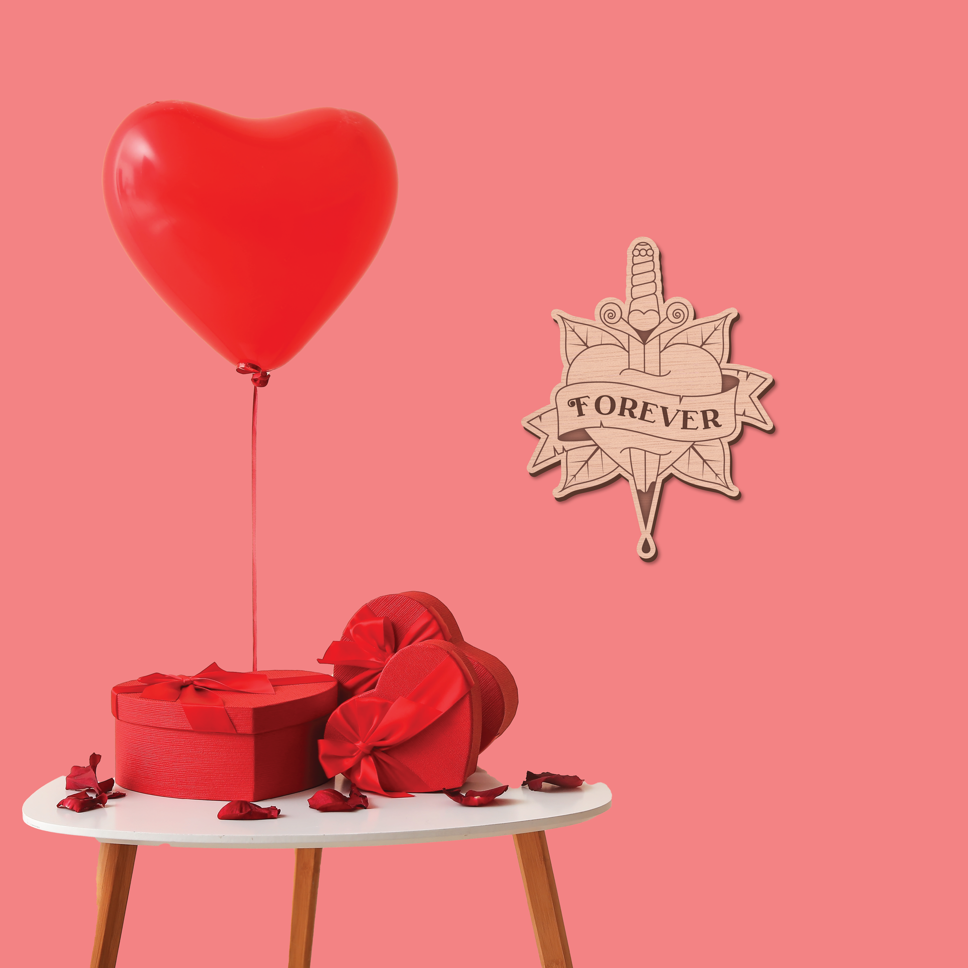 This dagger through heart tattoo plaque features the words 'Forever'. Hang this piece of art on your wall or door to make a statement in your home or room or give as a gift to remember. Laser cut with etched details.