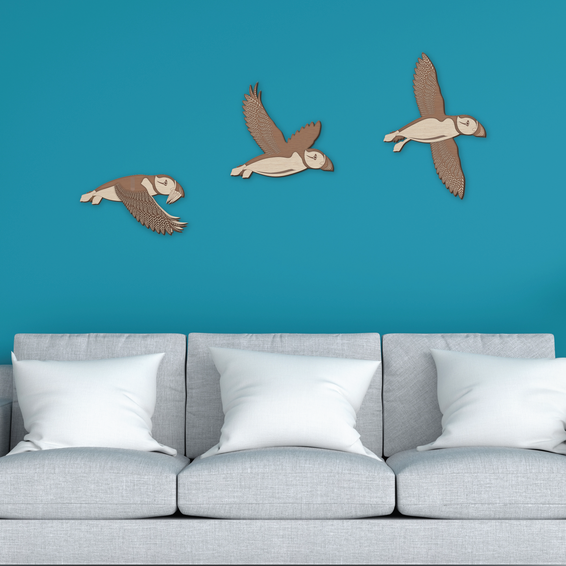 A collective of puffins is called a circus – we just love that! Love Rosie's set of 3 wall-hanging puffins will make you smile and be a focal point in any room. Puffins are social seabirds and love flying around together.