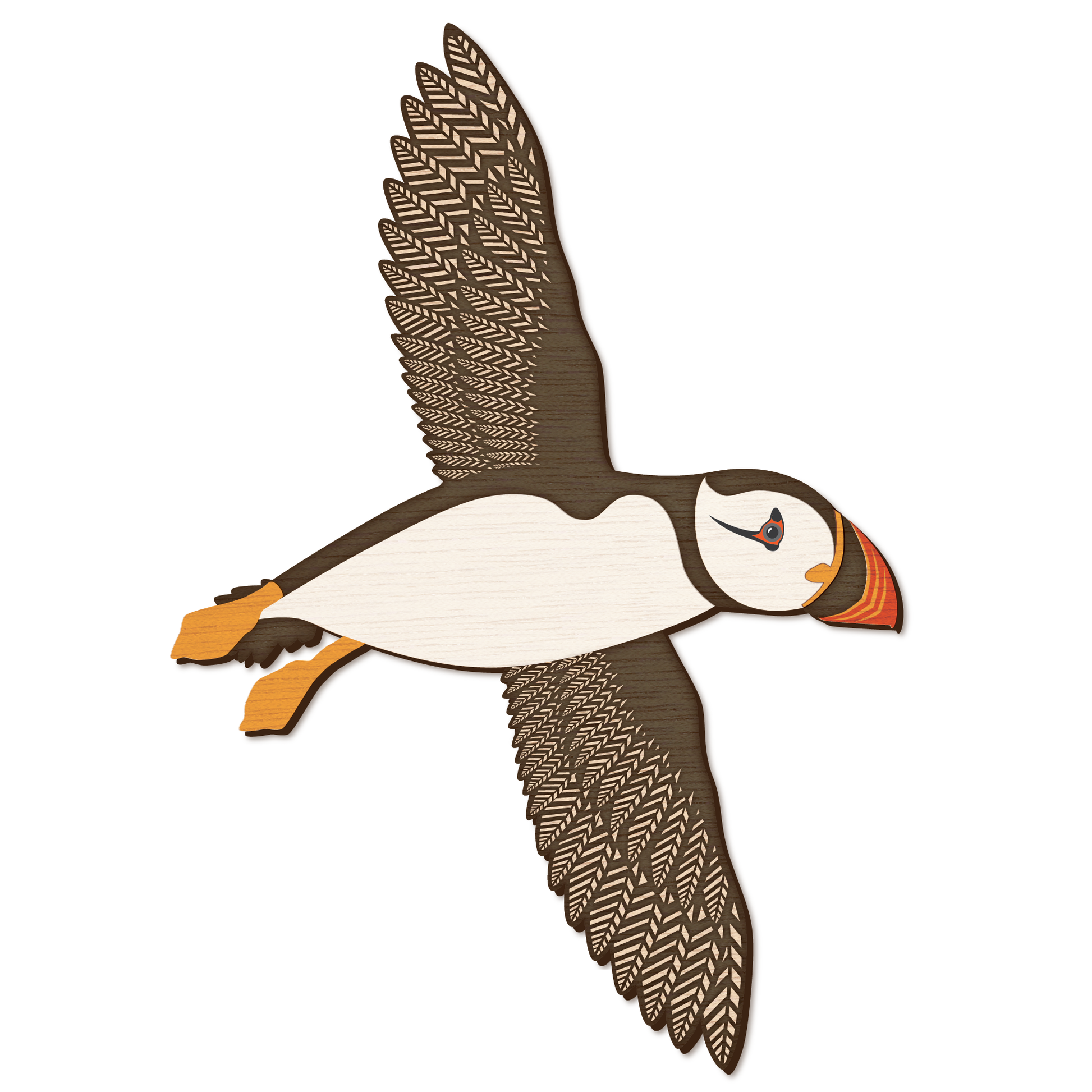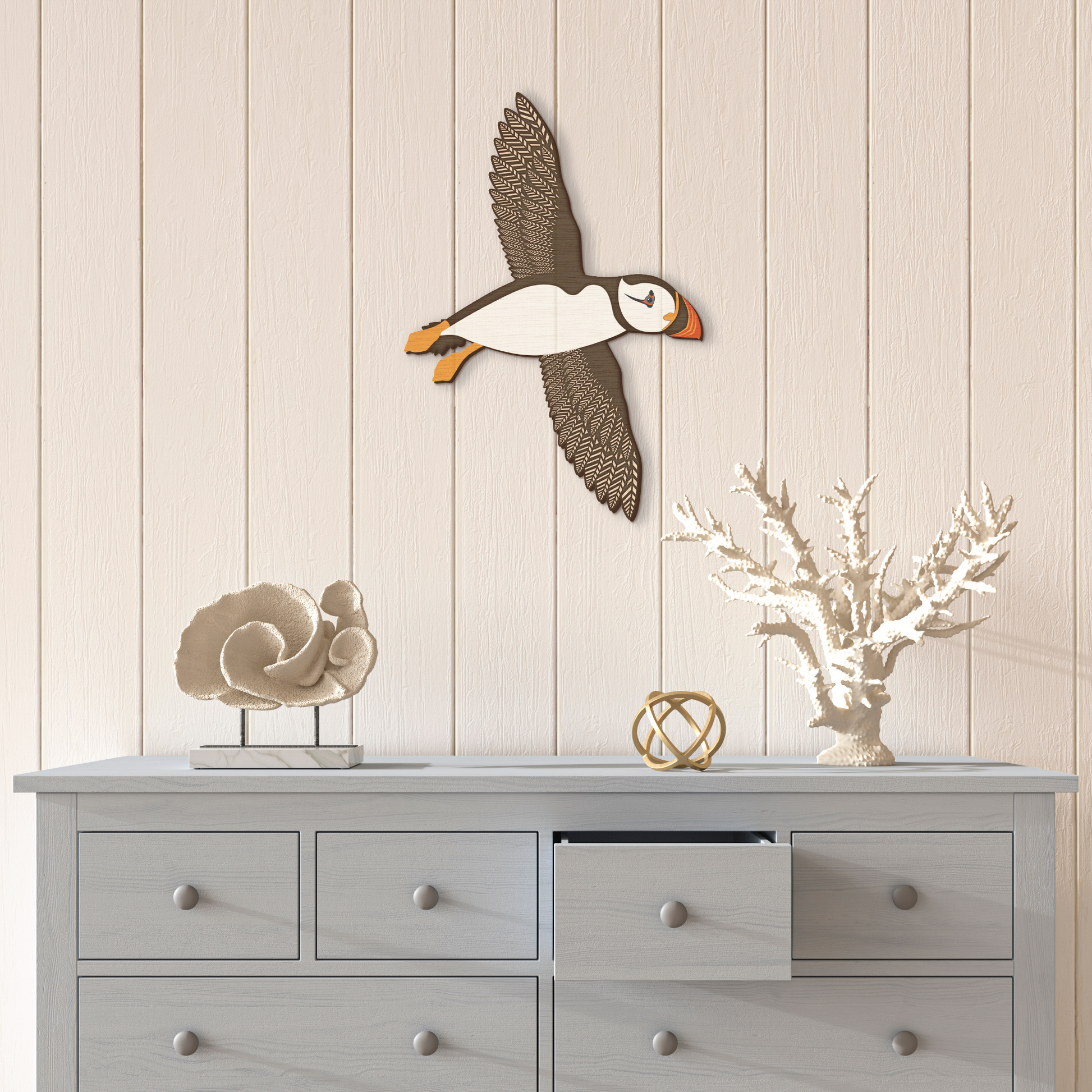 Puffins are curious little seabirds that live in social groups and are also known as parrots of the sea. Love Rosie's wall-hanging puffins are sure to make you smile and add interest to your room. This puffin has mastered flying high and is soaring on the wind.